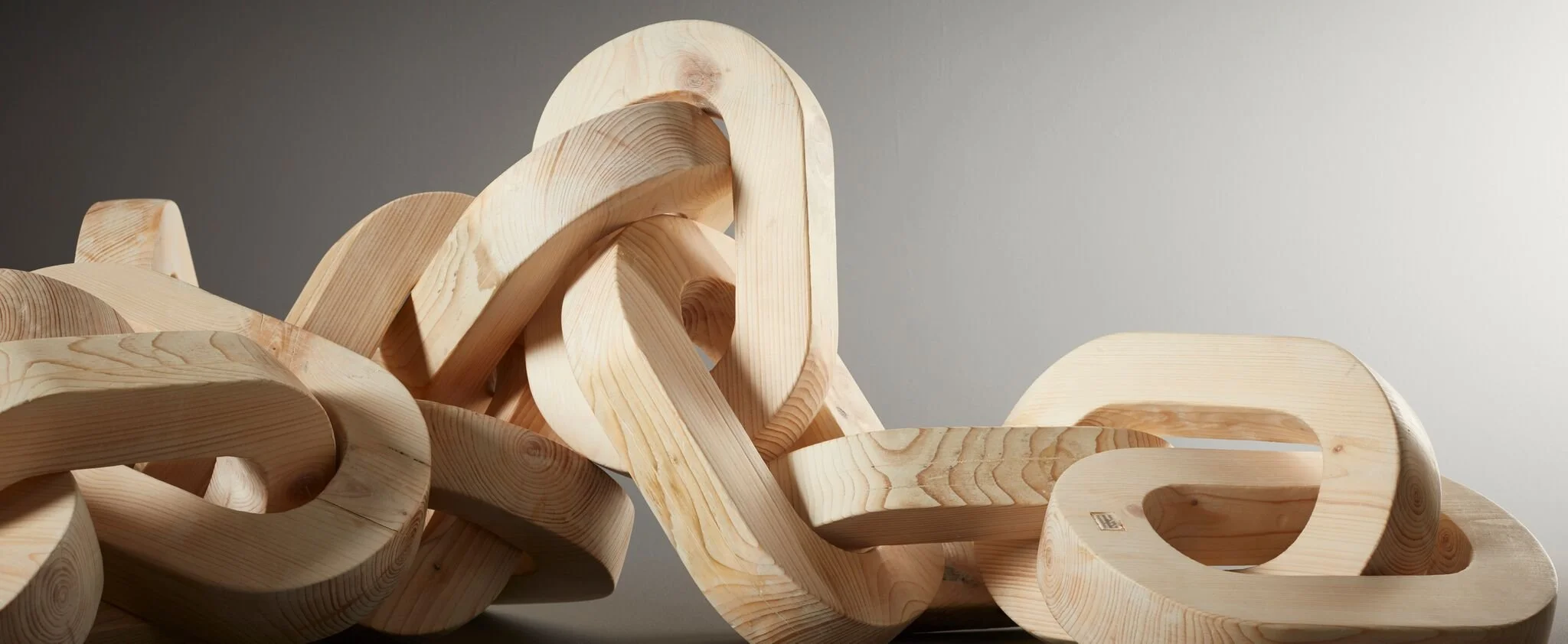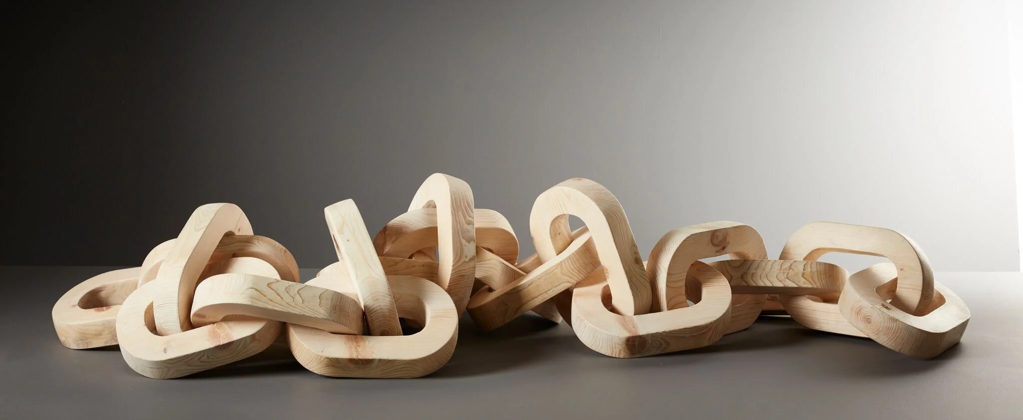 Hand-carved large wooden chain, entirely crafted from one single, continuous piece of pine.