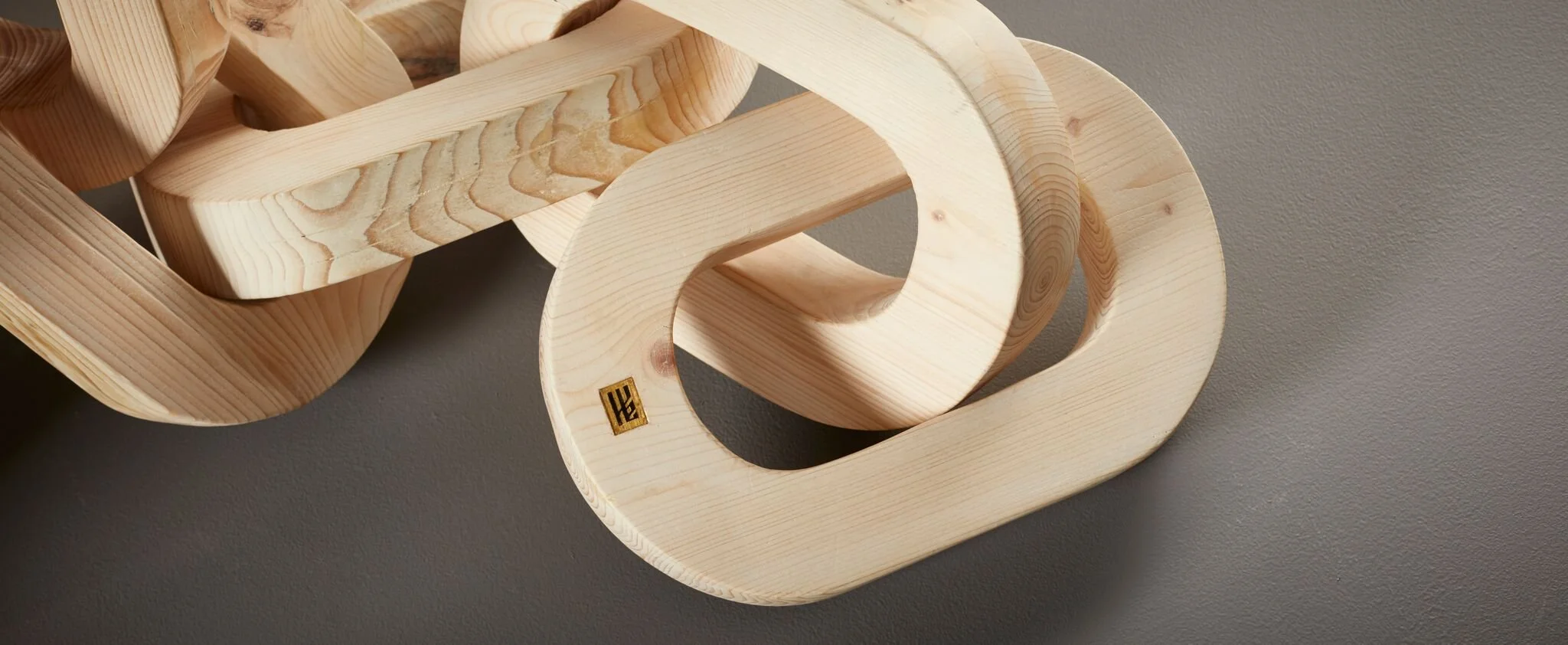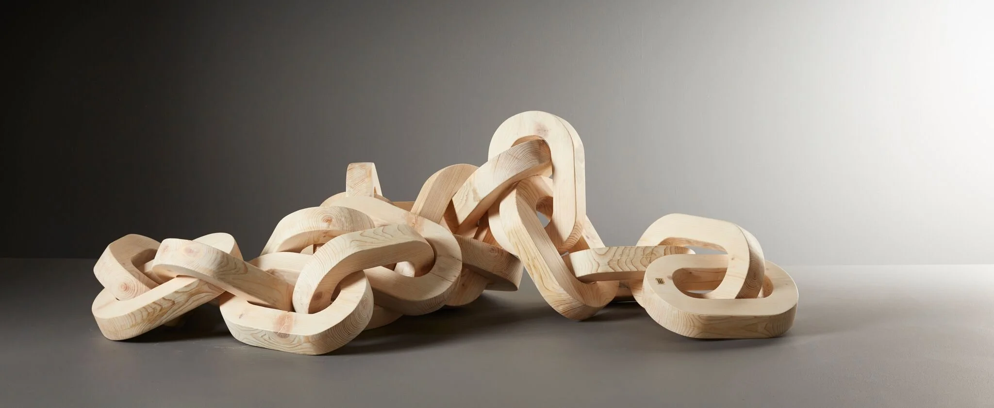 In this piece, I was interested in sympathetically pushing a natural material into new, unexpected configurations retaining the tactile feel of the wood. The open chain, a symbol of freedom, as well as representing the removal of a heavy weight upon one’s heart provided my initial inspiration, while at the same time conjuring childhood memories of play and feeling carefree through its scale and weight. It as if the object has a life of it’s own, depending on it’s arrangement.