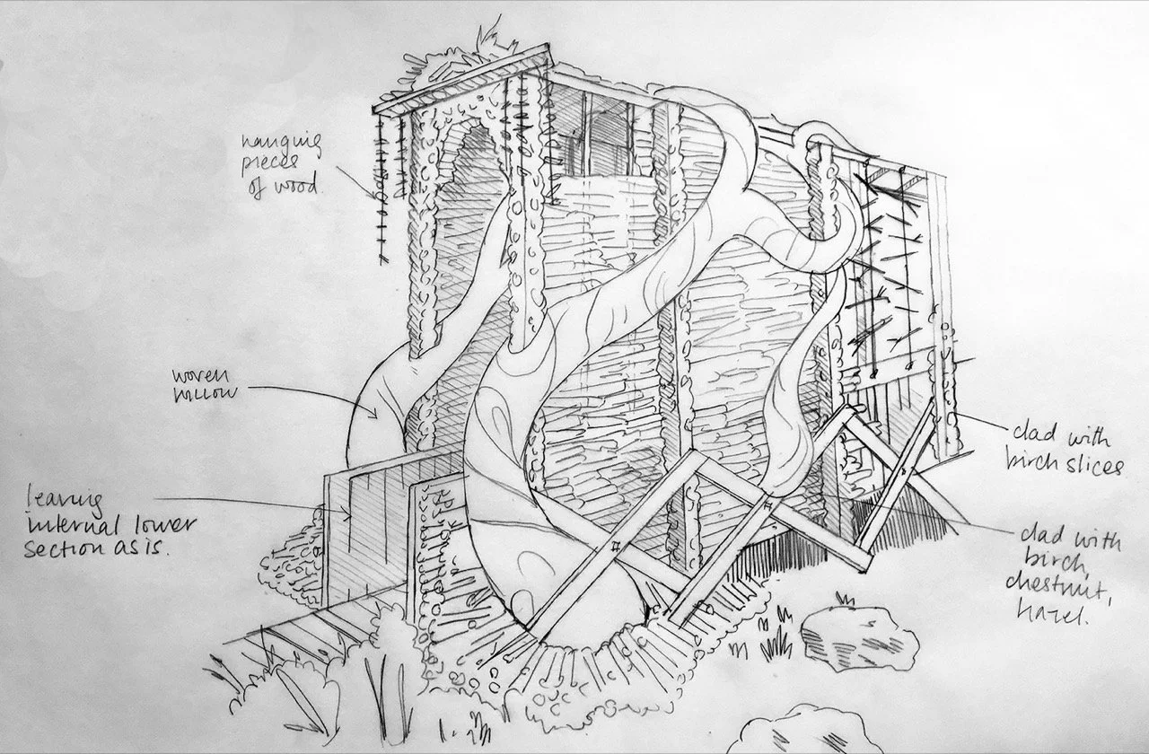 The core structure (image above) was already in place and I was asked to add “magic”. Local, ethically sourced timber was used to add an organic feel to the entrances.